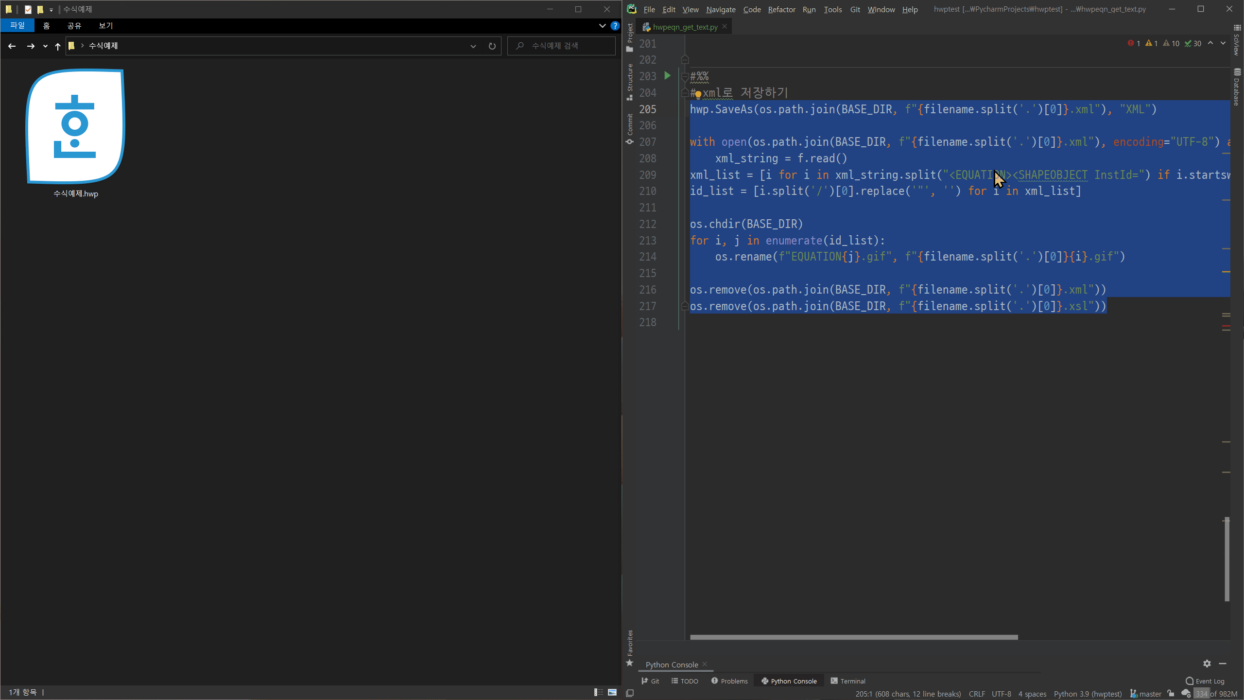 다만, 위 방법으로 저장하면 파일명이 EQUATION152875044.gif 방식으로 저장된다. 이걸 "수식예제1.png" 방식으로 저장하려면, 같이 저장되는 xsl이나 xml파일을 열어서 <SHAPEOBJECT InstId="xxxxxxxxxx"/>라는 태그의 "xxxxxxxxx"를 추출해서 rename에 활용하면 된다. 복잡할 것 같지만, os모듈을 사용하면 간단하다. 파일명 수정 코드를 추가하면 아래와 같다.
