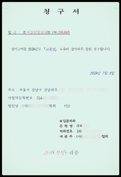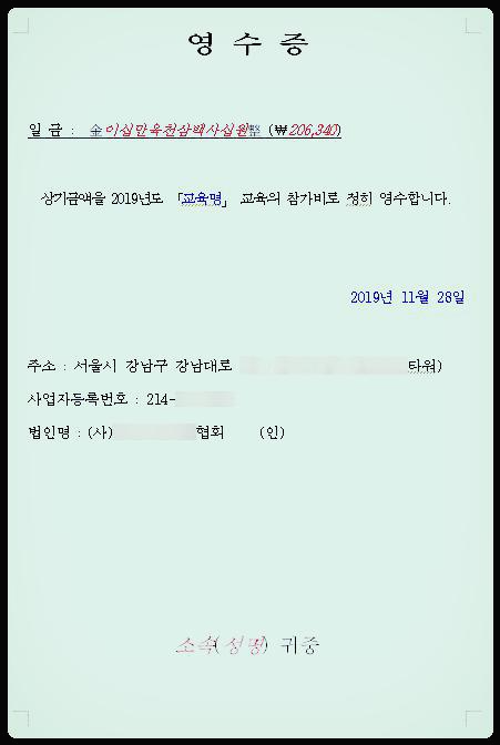 1번의 청구서 서식과 거의 동일하며, 입금확인 후 인원별 영수증을 위와 같이 발행하여 PDF변환 후 이메일로 송부한다.