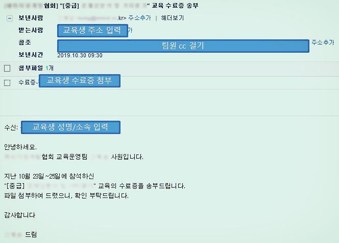 마지막으로, 수료증의 PDF출력을 마치면 아래와 같이 이메일로 개별송부한다.