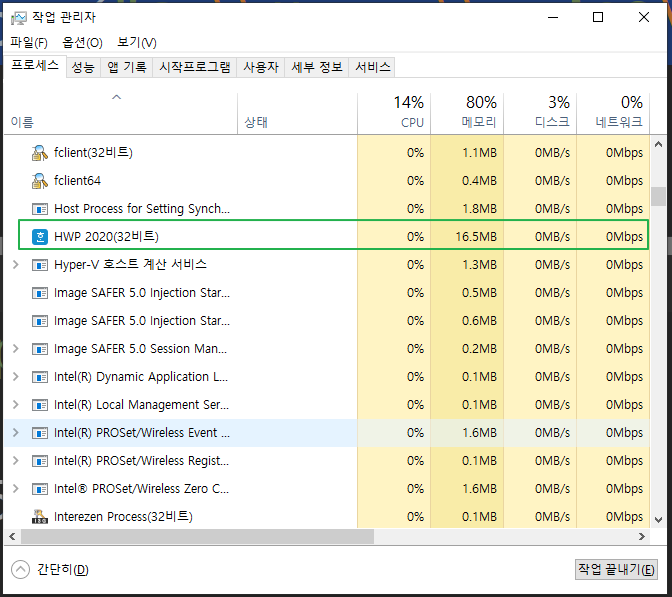 백그라운드 프로세스에 한/글이 실행되어 있는 것을 확인할 수 있다.