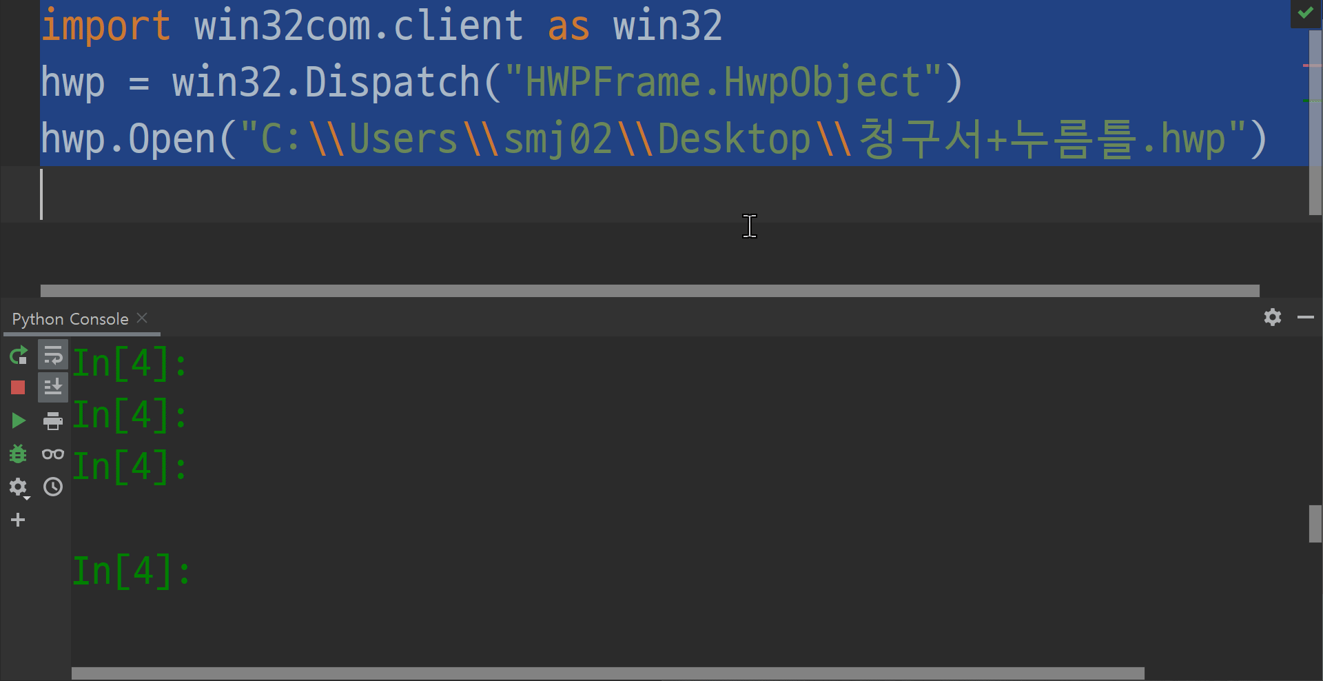 필자는 기존에 열려 있는 한글창을 파이썬으로 연결하는 방법을 모른다.