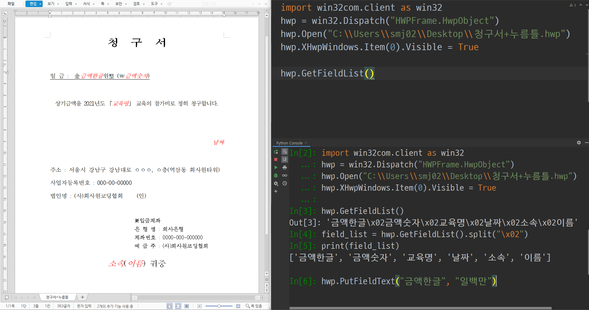 3. 파이썬으로 문서 누름틀에 값을 넣어보자.