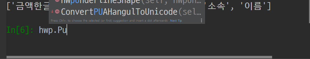 아래 콘솔창에 hwp.GetFieldList()를 입력하고 엔터를 치면,