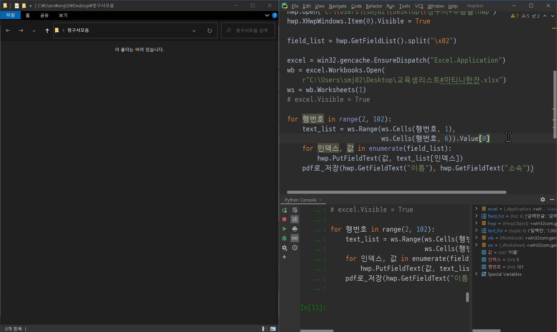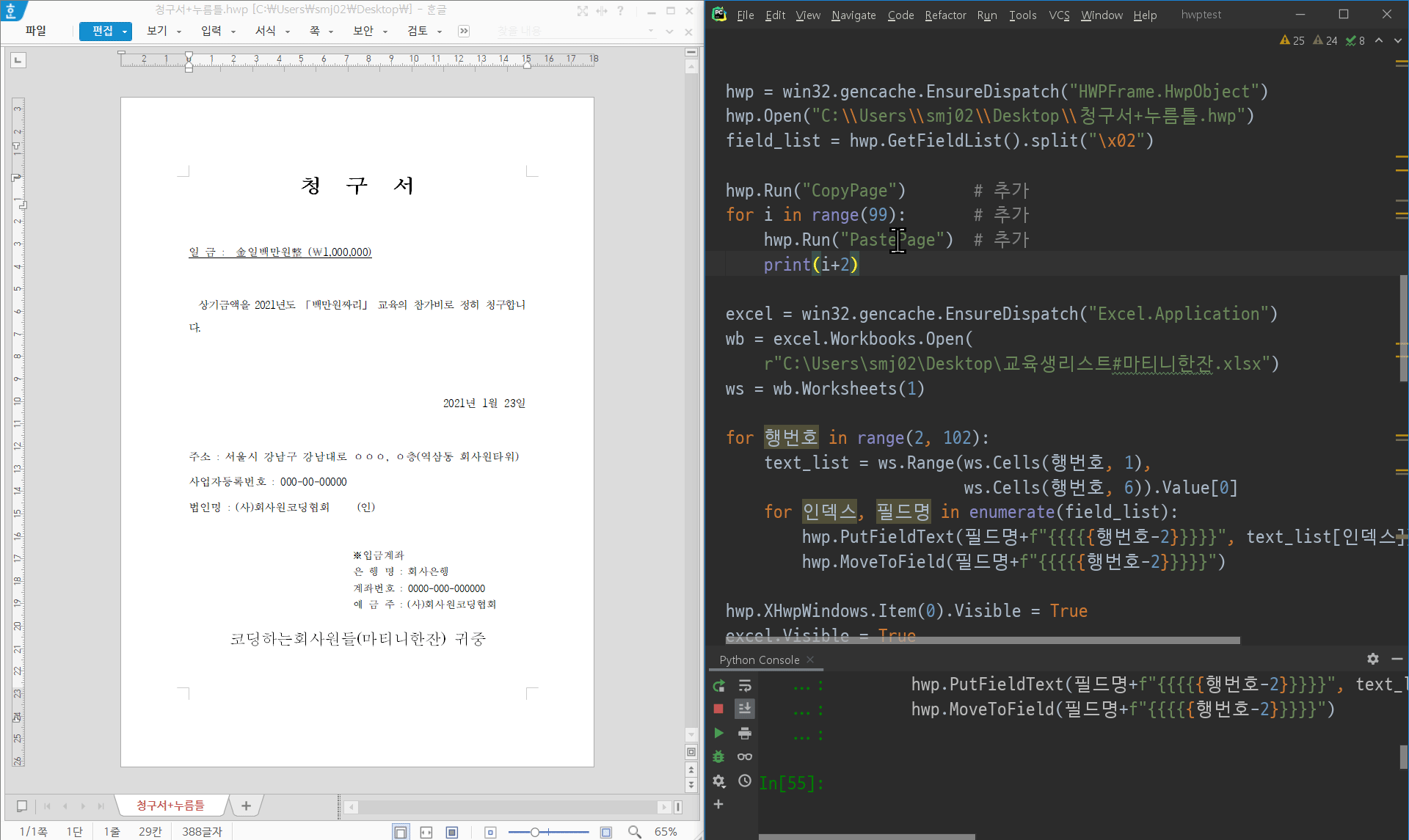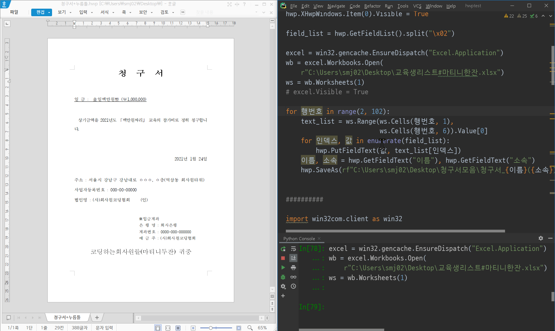 hwp.SaveAs(rf"C:\Users\smj02\Desktop\청구서모음\청구서_{이름}({소속}).hwp") # 수정