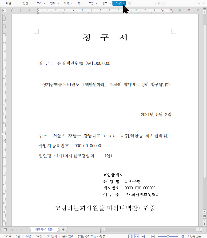 본 예제를 "청구서"에 국한하지 말고 독자들의 루틴한 보고업무 등에 적용해본다면,