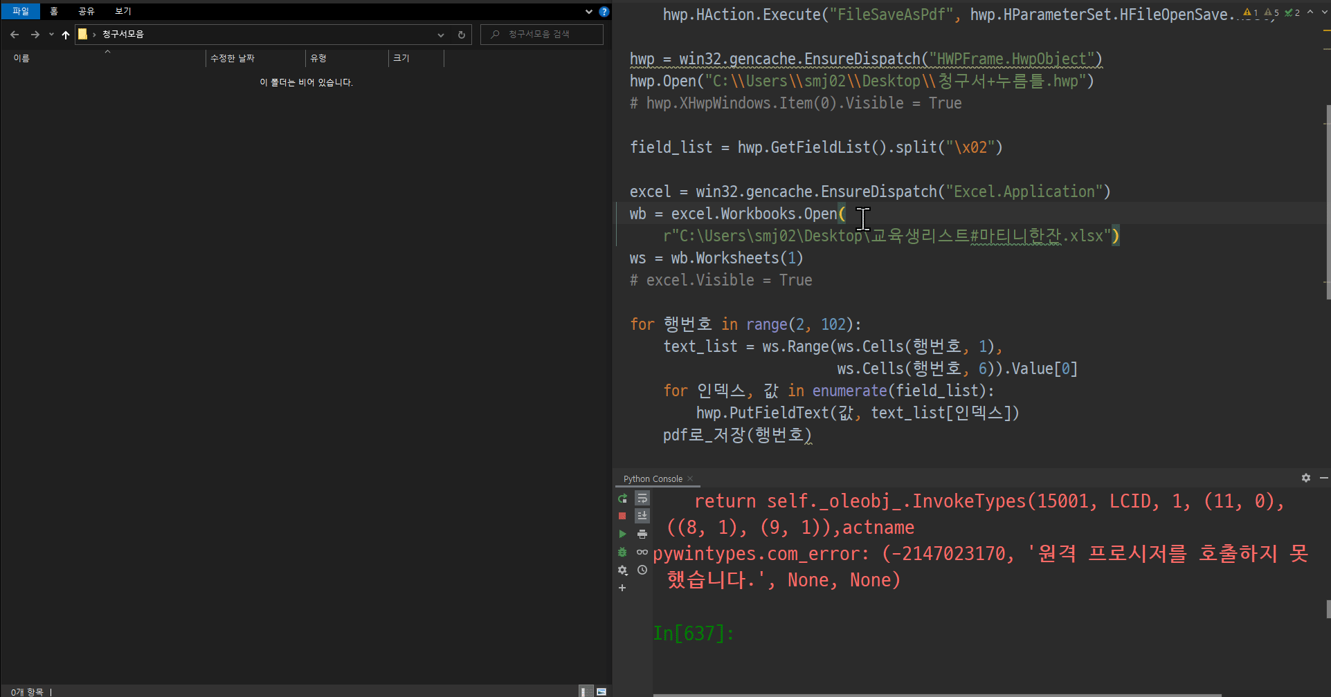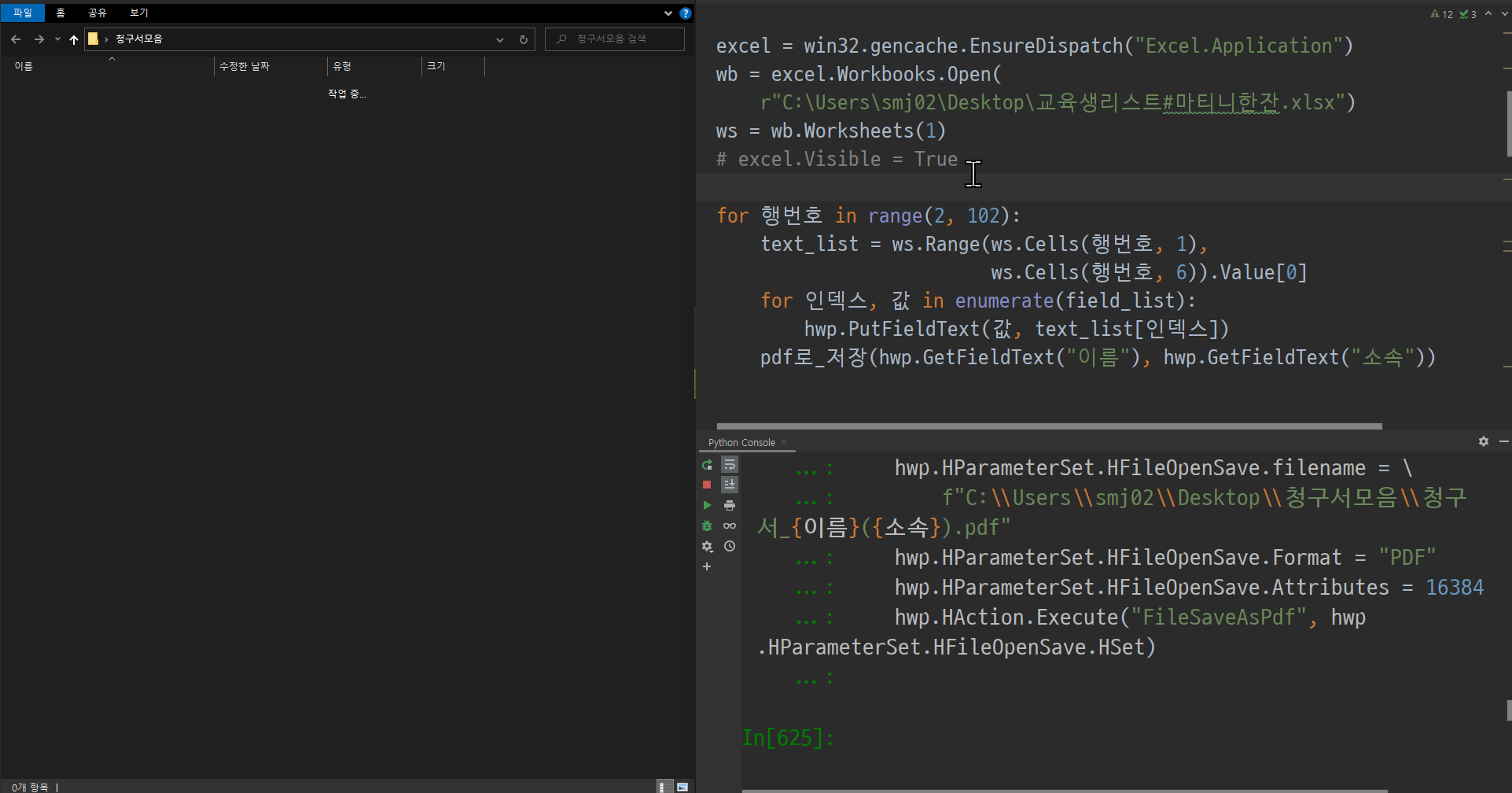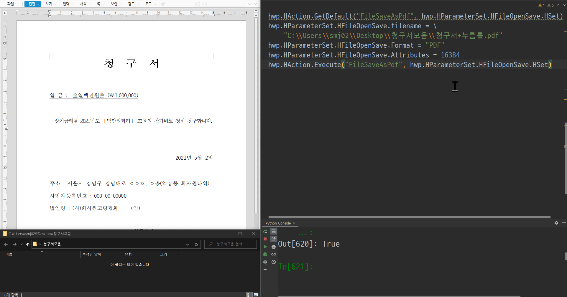 hwp.SaveAs(rf"C:\Users\smj02\Desktop\청구서모음\청구서_{이름}({소속}).hwp") # 수정