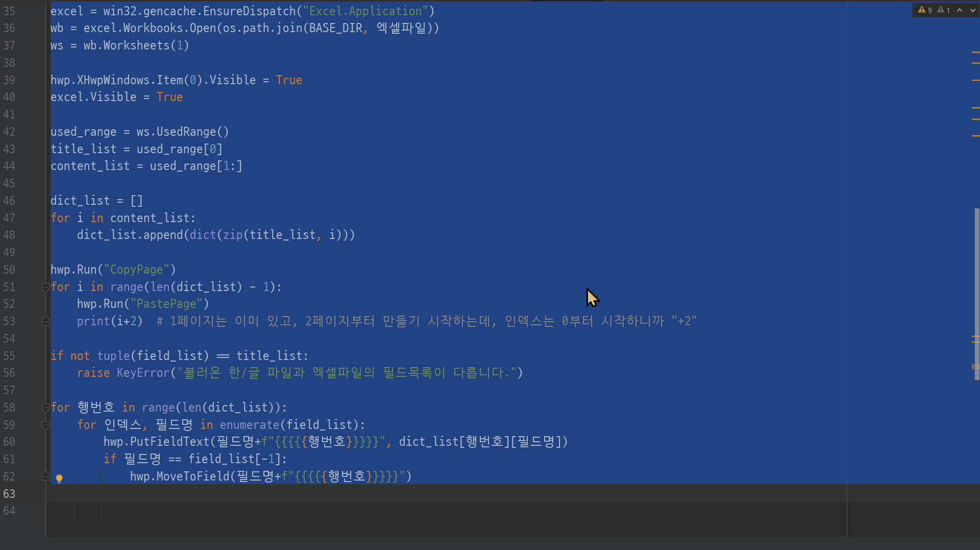 이번 포스팅 전반에 걸쳐 수정하는 부분은 한/글 API보다는 파이썬의 기본문법과 연관된 부분이 많을 것으로 생각된다.