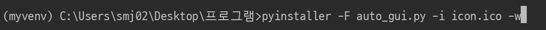 옵션 중 -F는 단일 EXE파일 한 개로 컴파일하는 옵션, -i 는 뒤의 아이콘파일로 실행파일 아이콘을 설정하는 옵션,