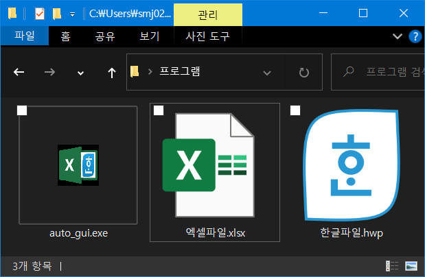 실행파일과 한/글 파일, 엑셀파일 하나씩을 같은 폴더 안에 두면