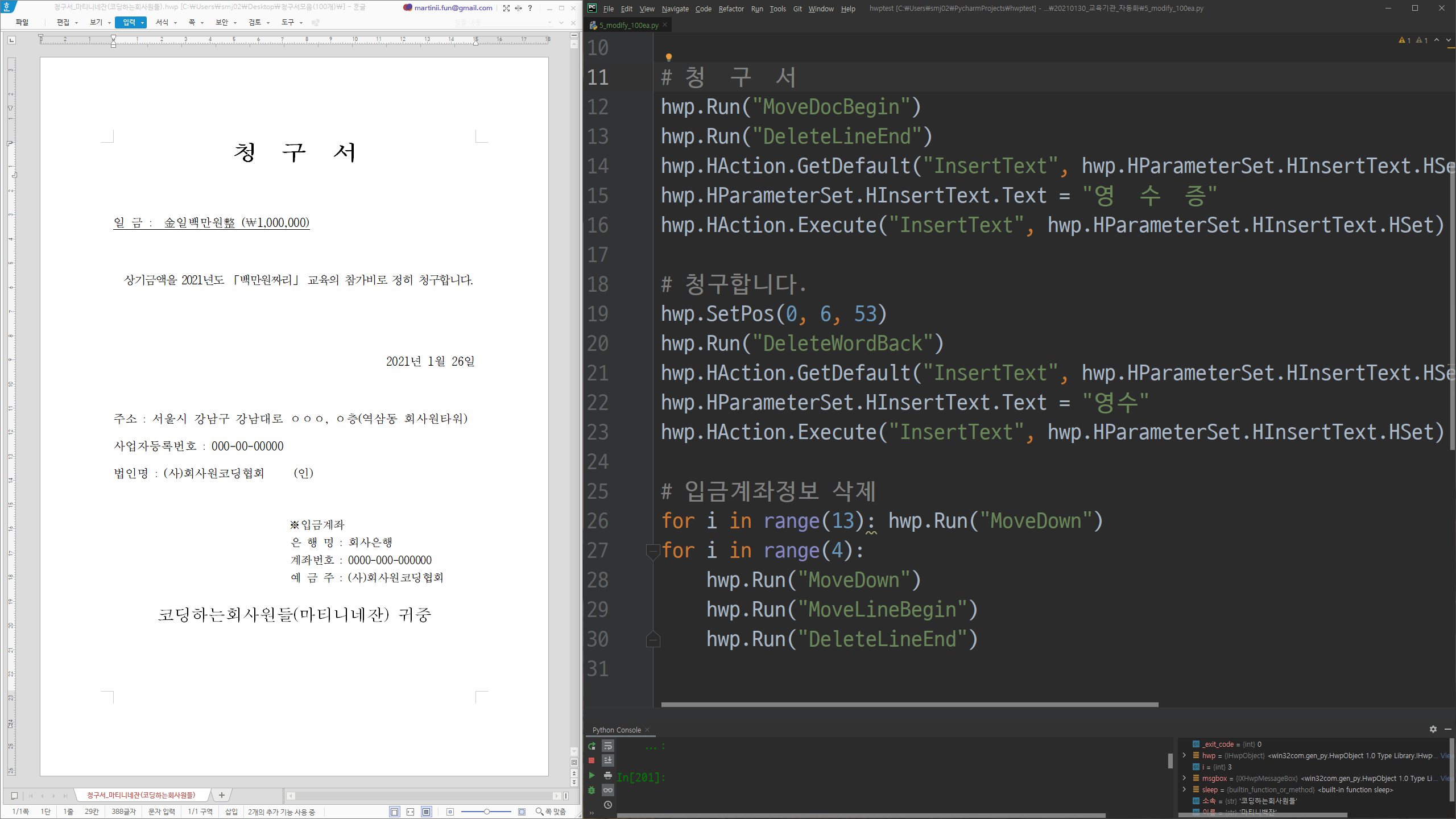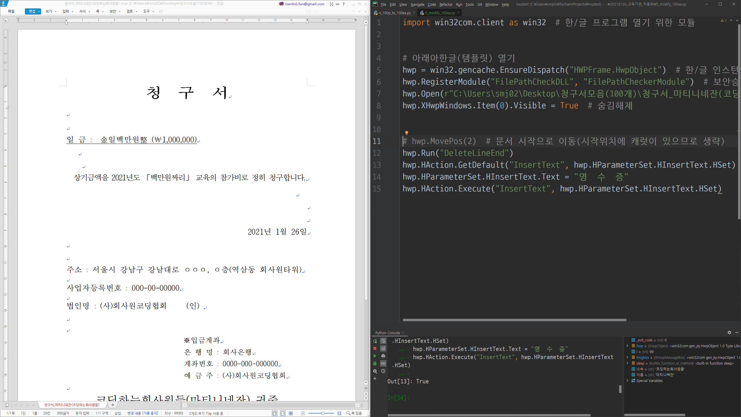 1) 파이썬을 통해 기존에 만들어진 백장의 청구서.HWP 파일 내용을 하나씩 쪼개서 다시 백개의 HWP로 만들기
