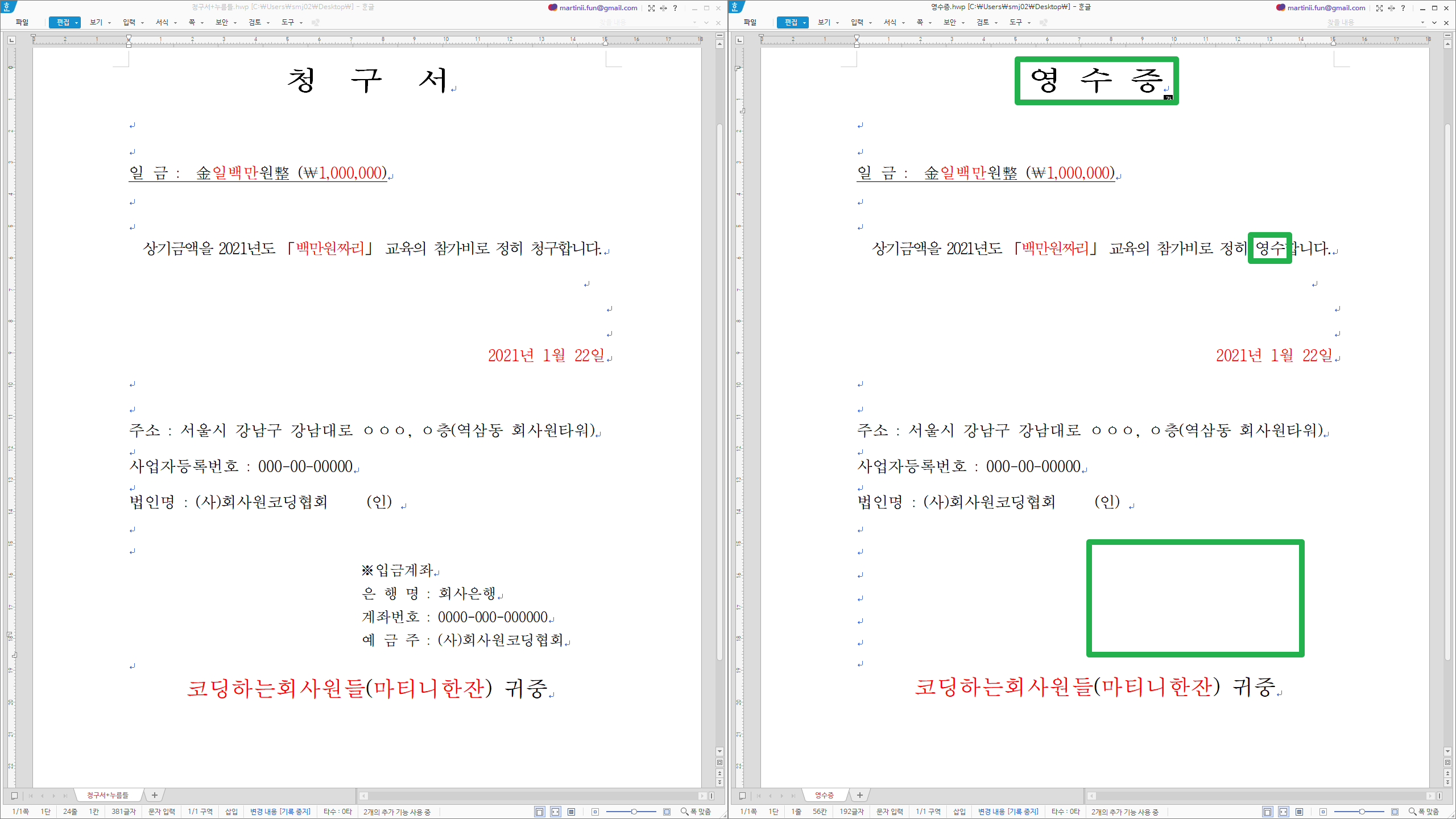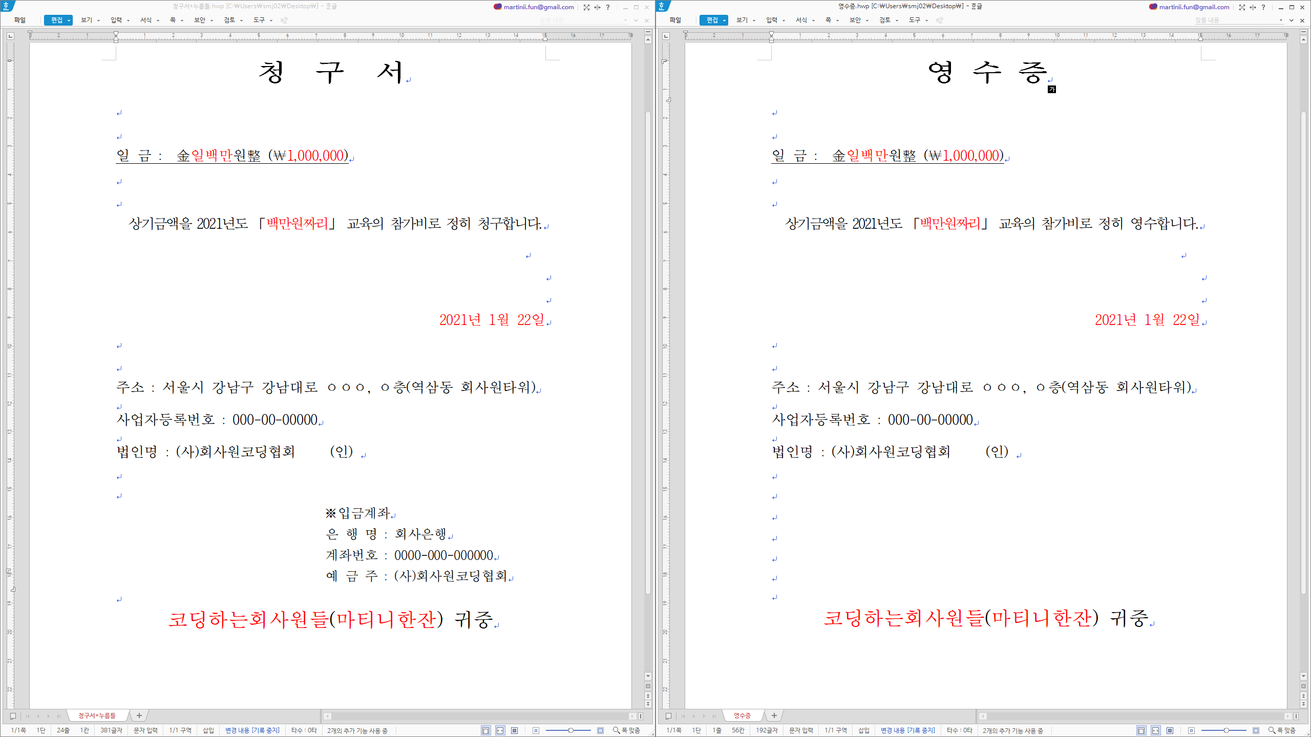 아래 이미지의 좌측은 지난 포스팅에 만들었던 청구서 서식이고, 우측이 새로 작성할 영수증 서식이다.