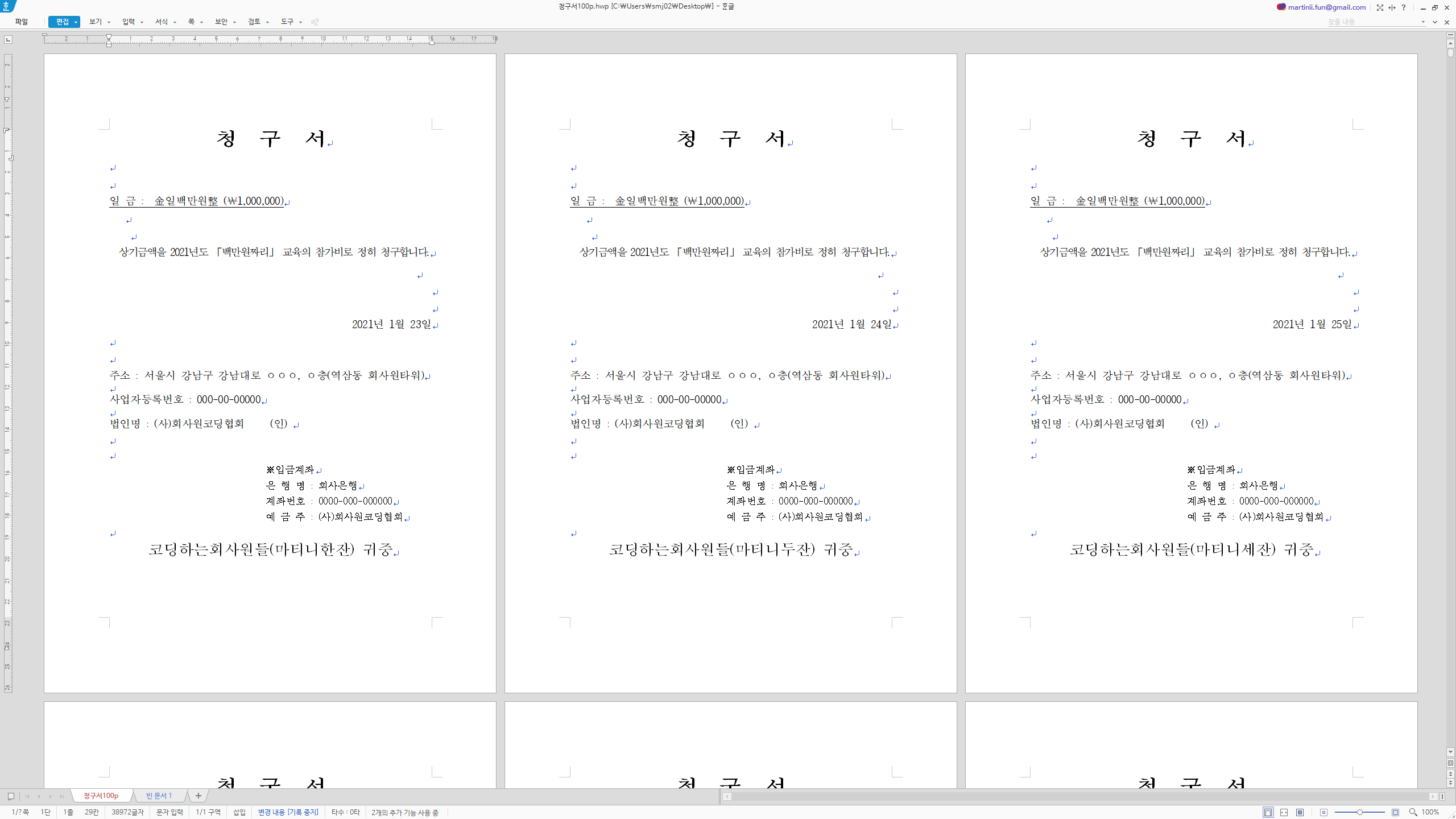 위 3개 과정을 진행하기 위해 직전의 포스팅에서 완성했던 100장짜리 청구서를 열어서
