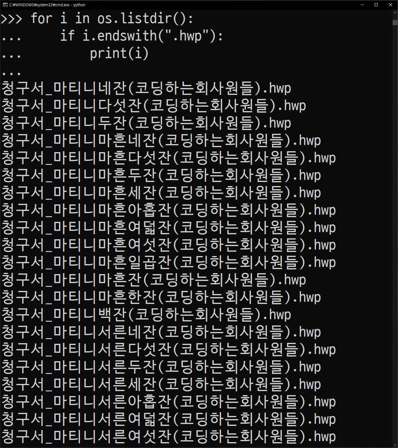 hwp_list = [i for i in os.listdir() if i.endswith(".hwp")] # 현재 폴더에서 HWP만 골라 리스트 생성