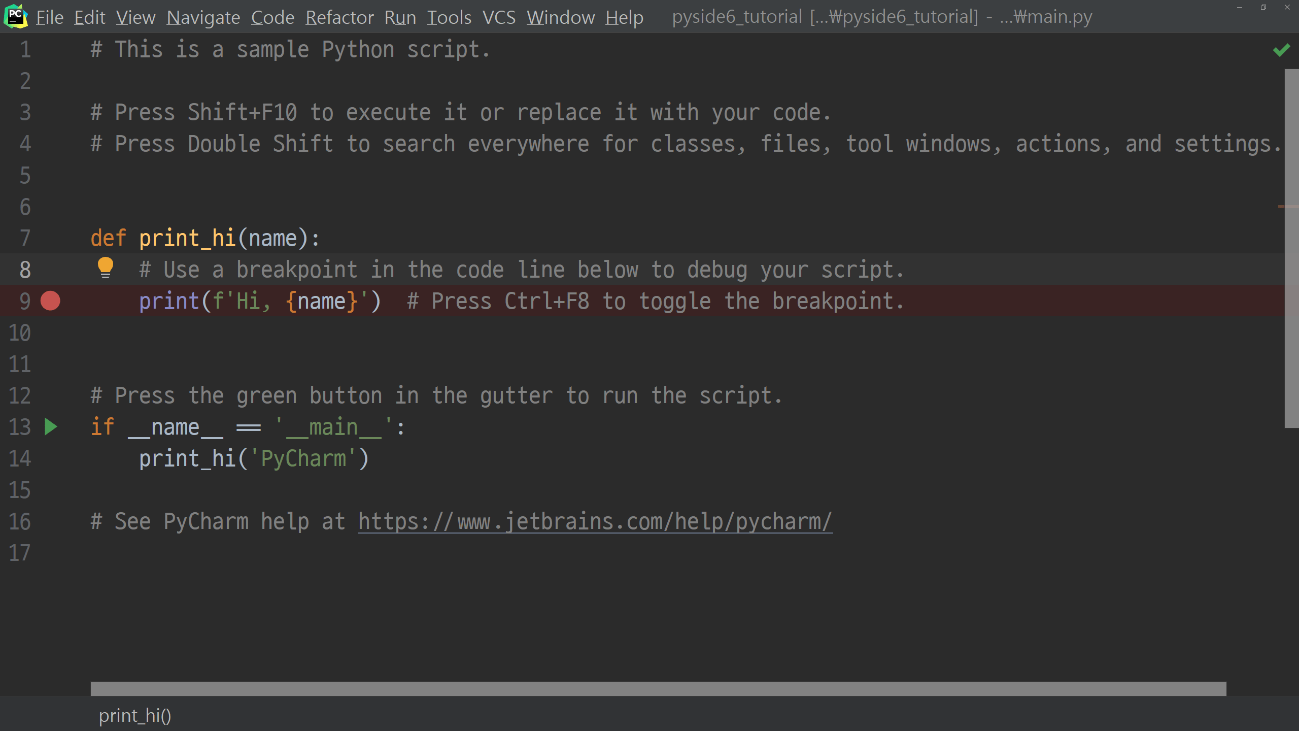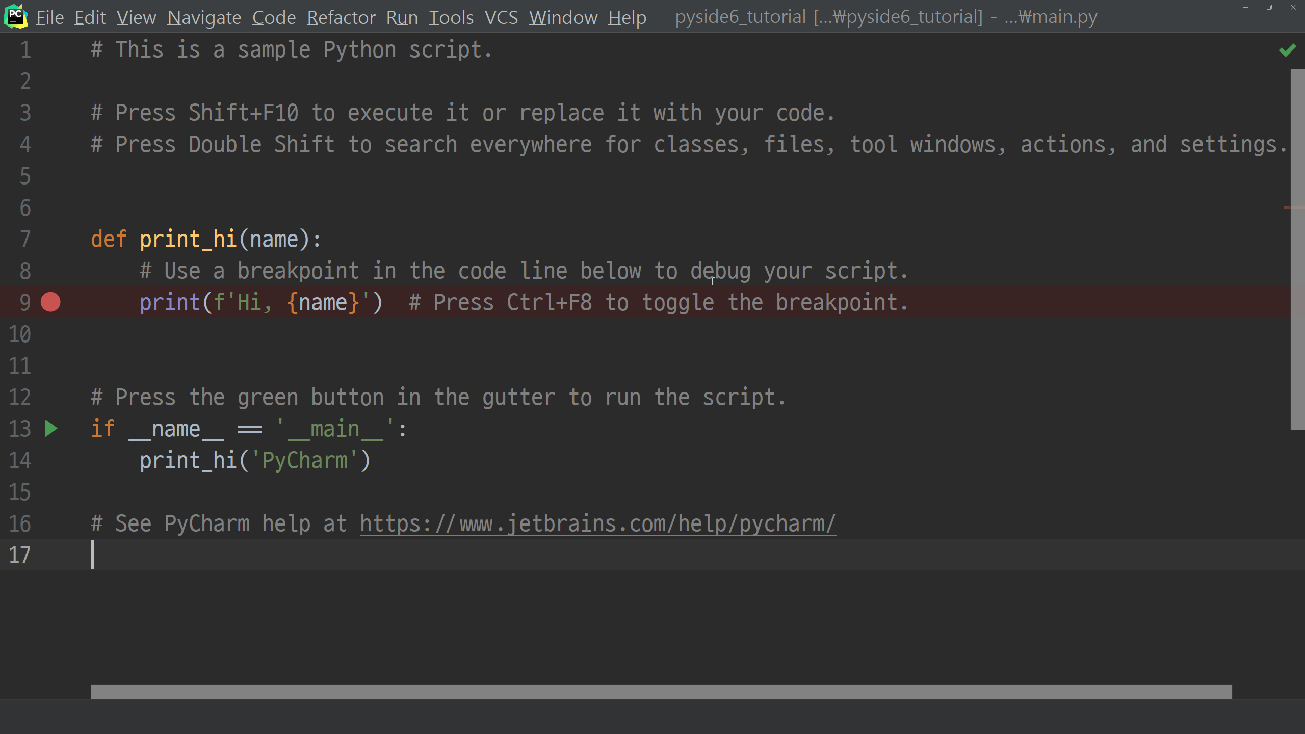 이제 PySide6의 설치를 마쳤으니 샘플코드를 한 번 실행해보고 이번 포스팅을 마칠 예정입니다. 프로젝트 루트의 main.py의 내용을 모두 지우고 아래처럼 입력해 주시기 바랍니다.