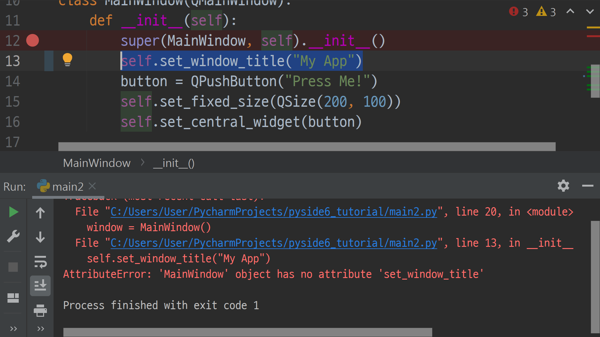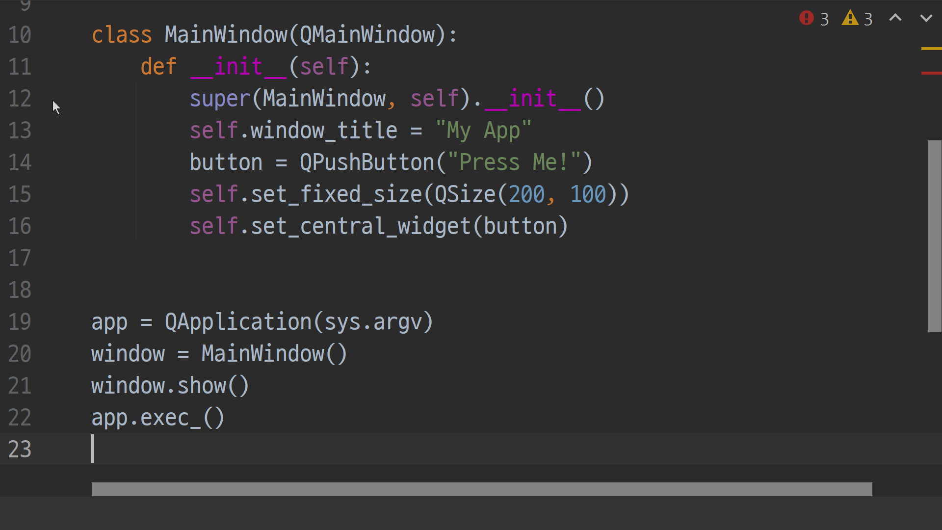 setWindowTitle("My App")의 변경된 문법이 set_window_title("My App")일 거라고 짐작하고 코드를 입력한 후 실행해보니 오류가 발생하네요. 에디터창에서 자동완성(Ctrl-Space) 기능을 써봐도, 제대로 된 메서드이름을 잡아주지 않습니다.