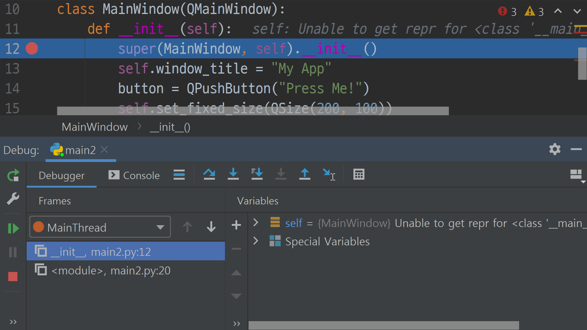 위 캡쳐화면처럼 12번 라인 super().__init__()에 브레이크포인트 찍고 디버깅을 해보면 아래와 같이 나오거든요.
