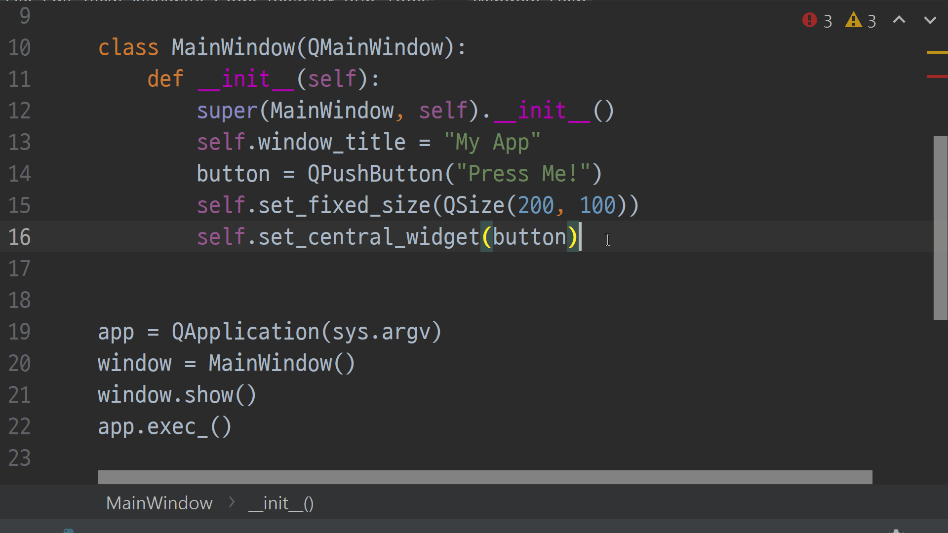 setWindowTitle("My App")의 변경된 문법이 set_window_title("My App")일 거라고 짐작하고 코드를 입력한 후 실행해보니 오류가 발생하네요. 에디터창에서 자동완성(Ctrl-Space) 기능을 써봐도, 제대로 된 메서드이름을 잡아주지 않습니다.