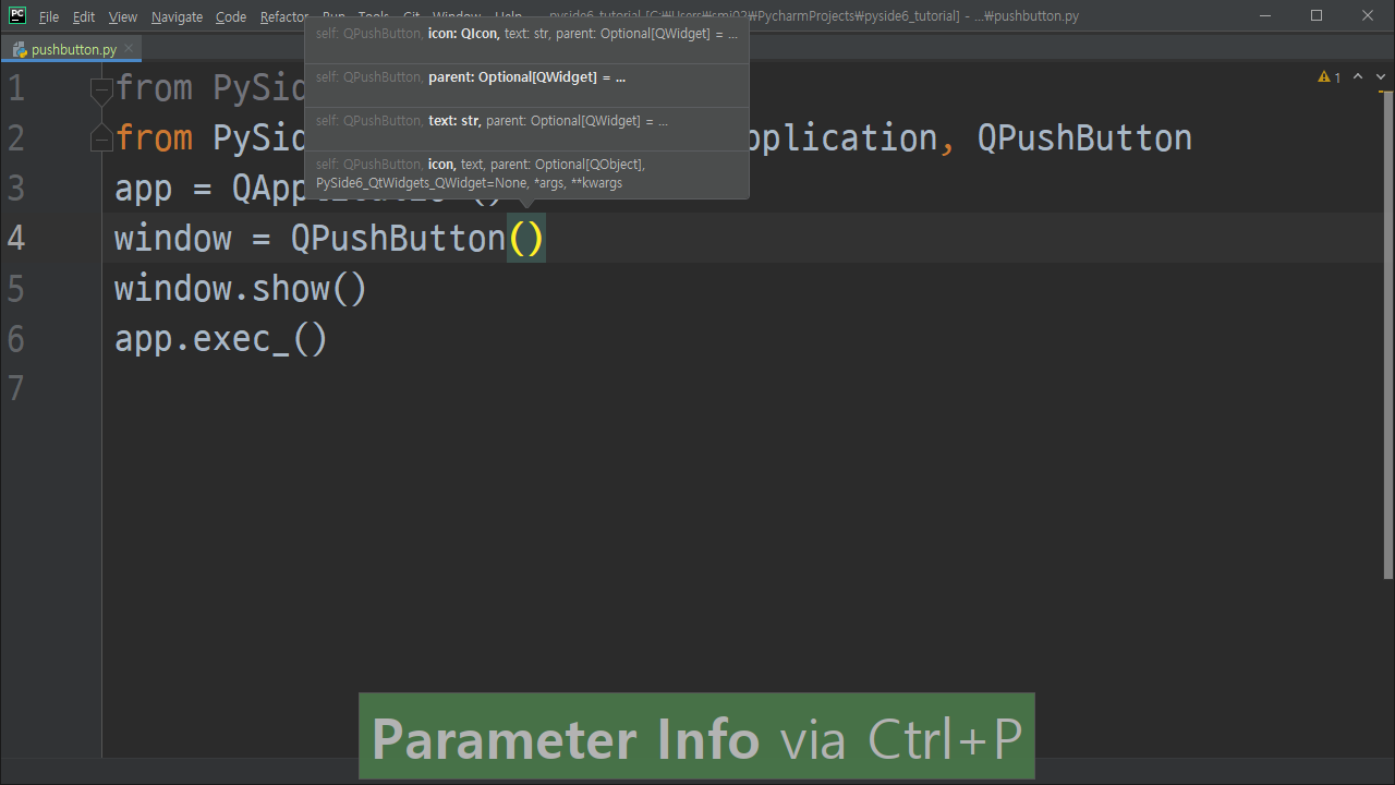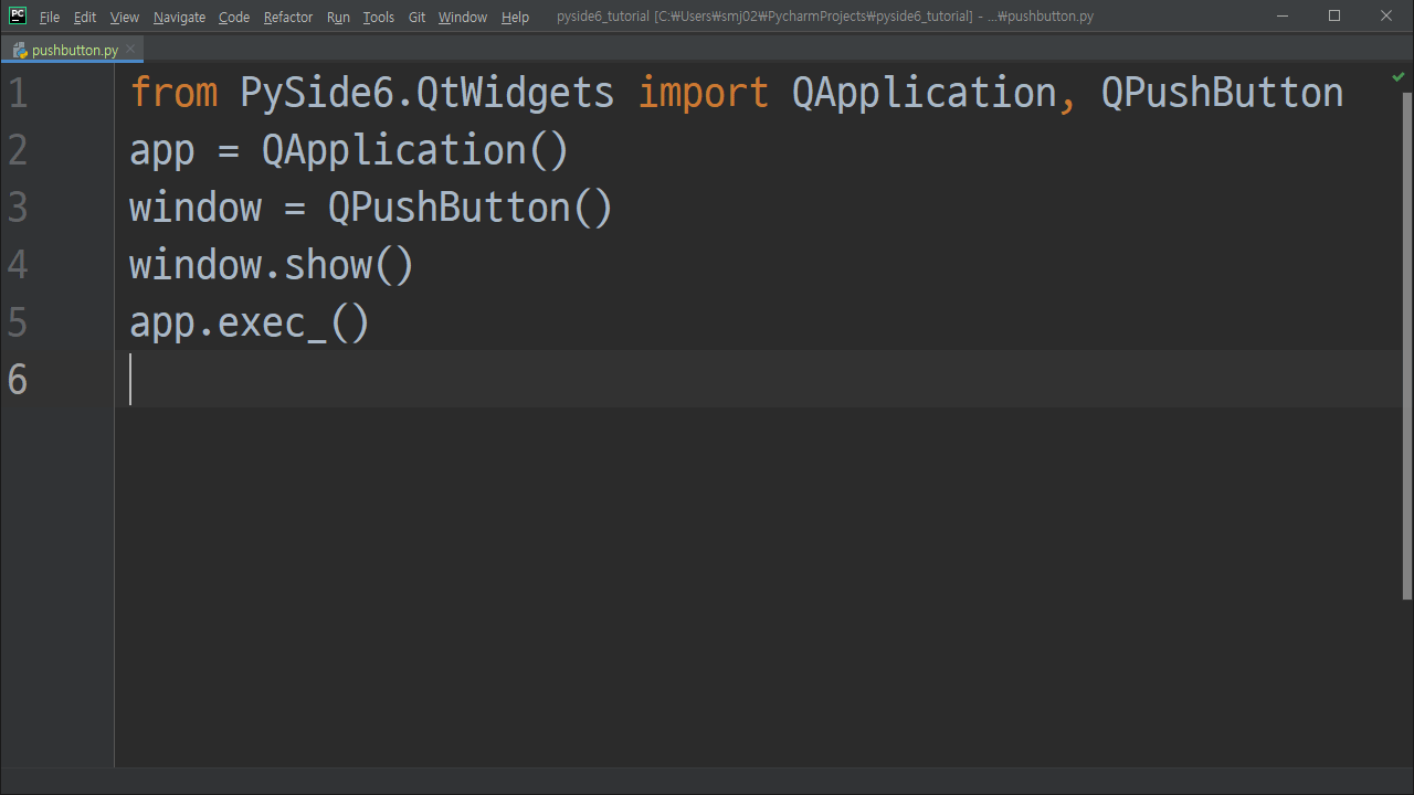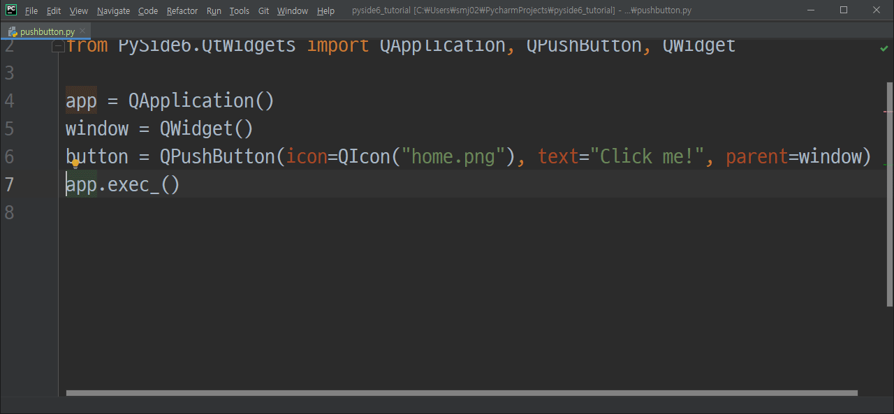파이참으로 위 코드의 QWidget을 QPushButton으로 바꿔보겠습니다.