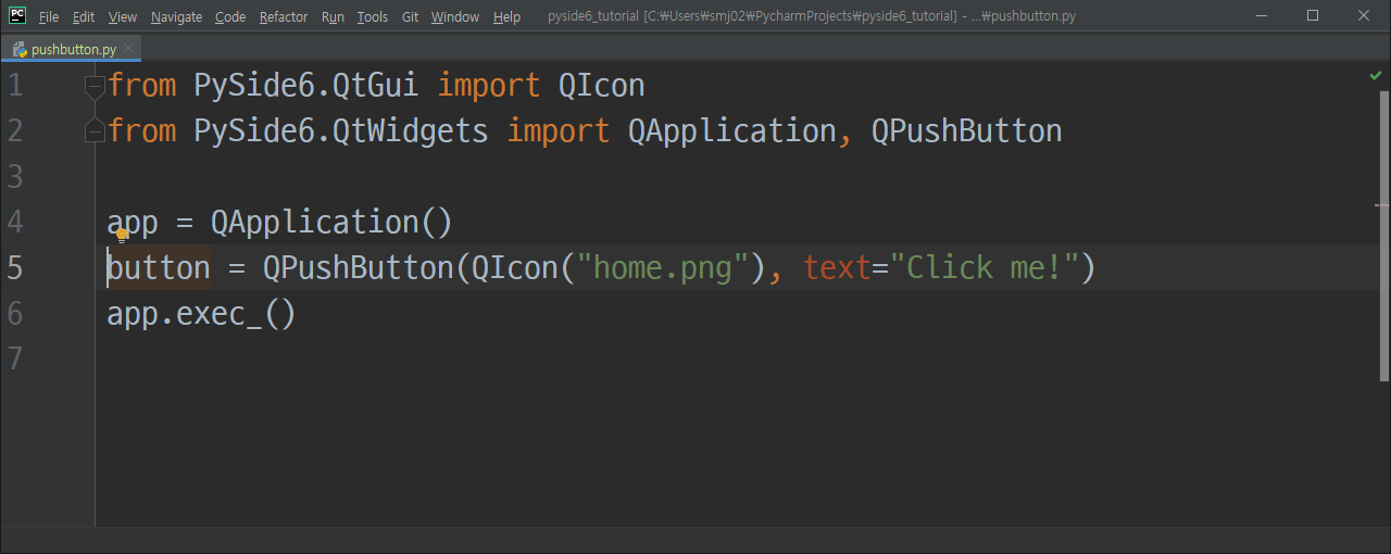 파이참으로 위 코드의 QWidget을 QPushButton으로 바꿔보겠습니다.