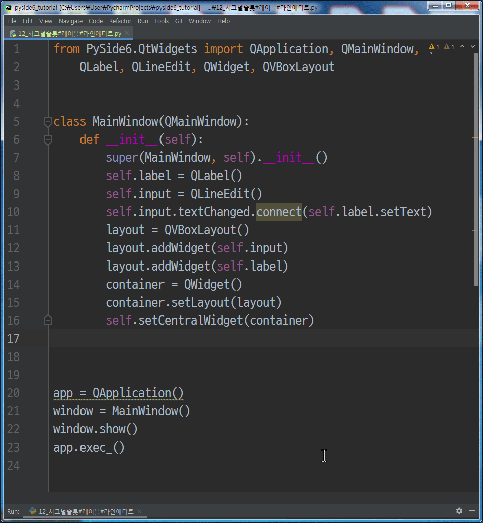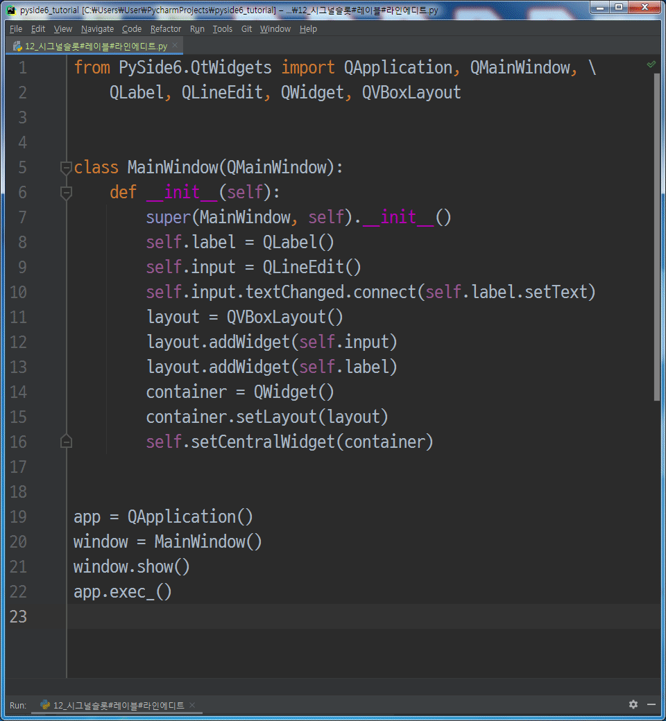 라인12~13: layout.addWidget(self.input); layout.addWidget(self.label)