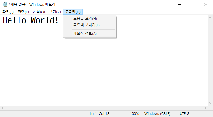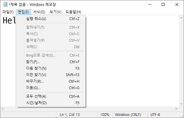 단축키를 다 정의하셨으면, 이제 원래의 메모장과 메뉴바 비교를 한 번 해보겠습니다.