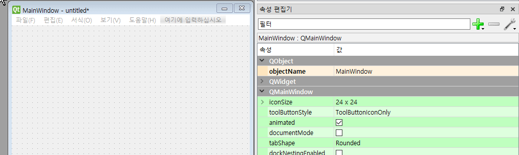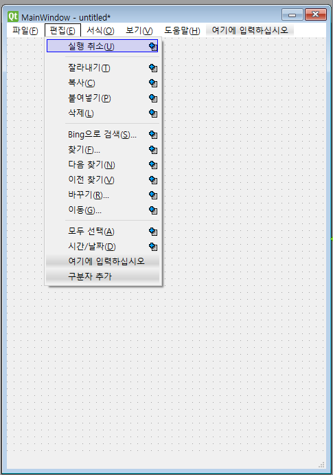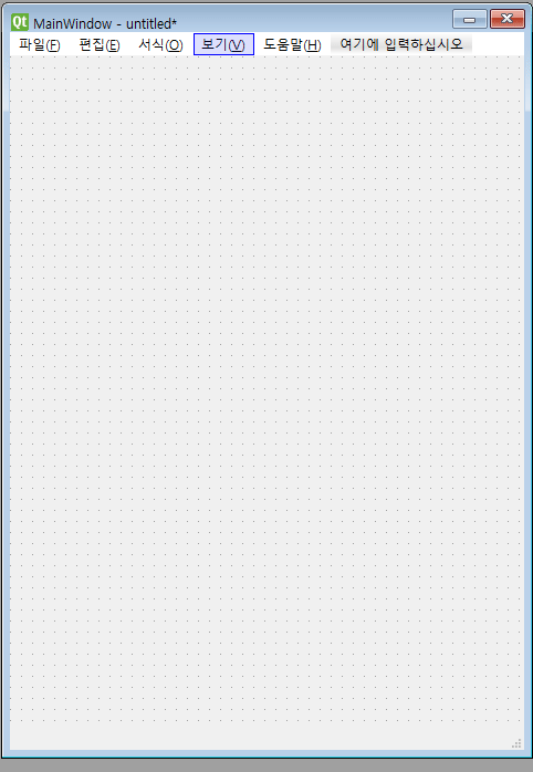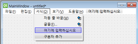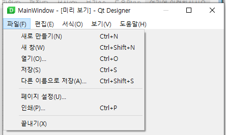 또한 QtDesigner에서 Ctrl-r을 누르면 미리보기창이 열립니다. "파일"메뉴만 완성하고 나서 미리보기(Ctrl-r)를 실행해봅시다.