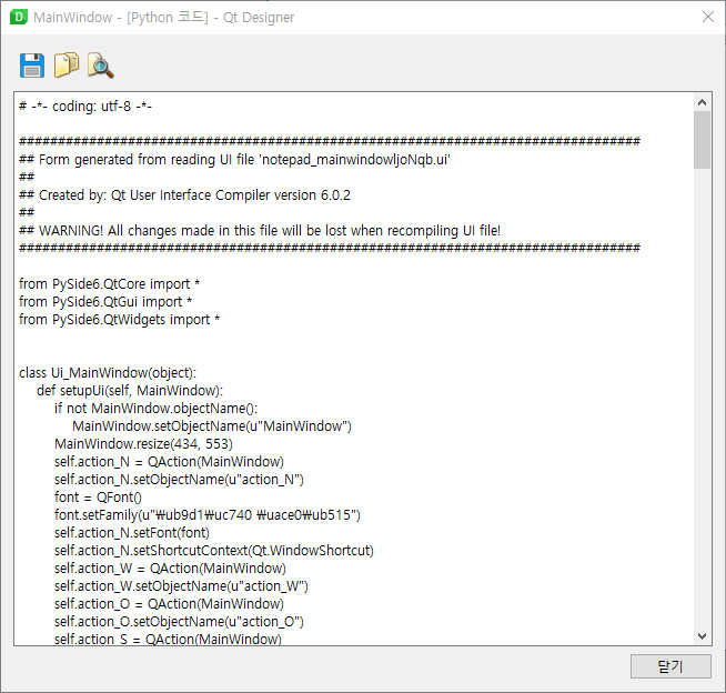 QtDesigner메뉴 중, "폼(O)-Python 코드 보기(P)..." 메뉴를 선택해봅시다.