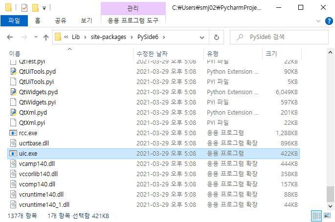 현재 uic.exe는 bin폴더가 아니라 상위폴더인 PySide6에 들어 있어요. PySide6 폴더에서 bin이라는 폴더를 생성하고 PySide6 폴더의 uic.exe 파일을 복사해서 bin 폴더 안에 넣으면 끝.