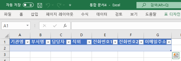 ws.Range("A1:G1").Value = ("기관명", "부서명", "담당자", "직위", "전화번호1", "전화번호2", "이메일주소") # 제목 입력