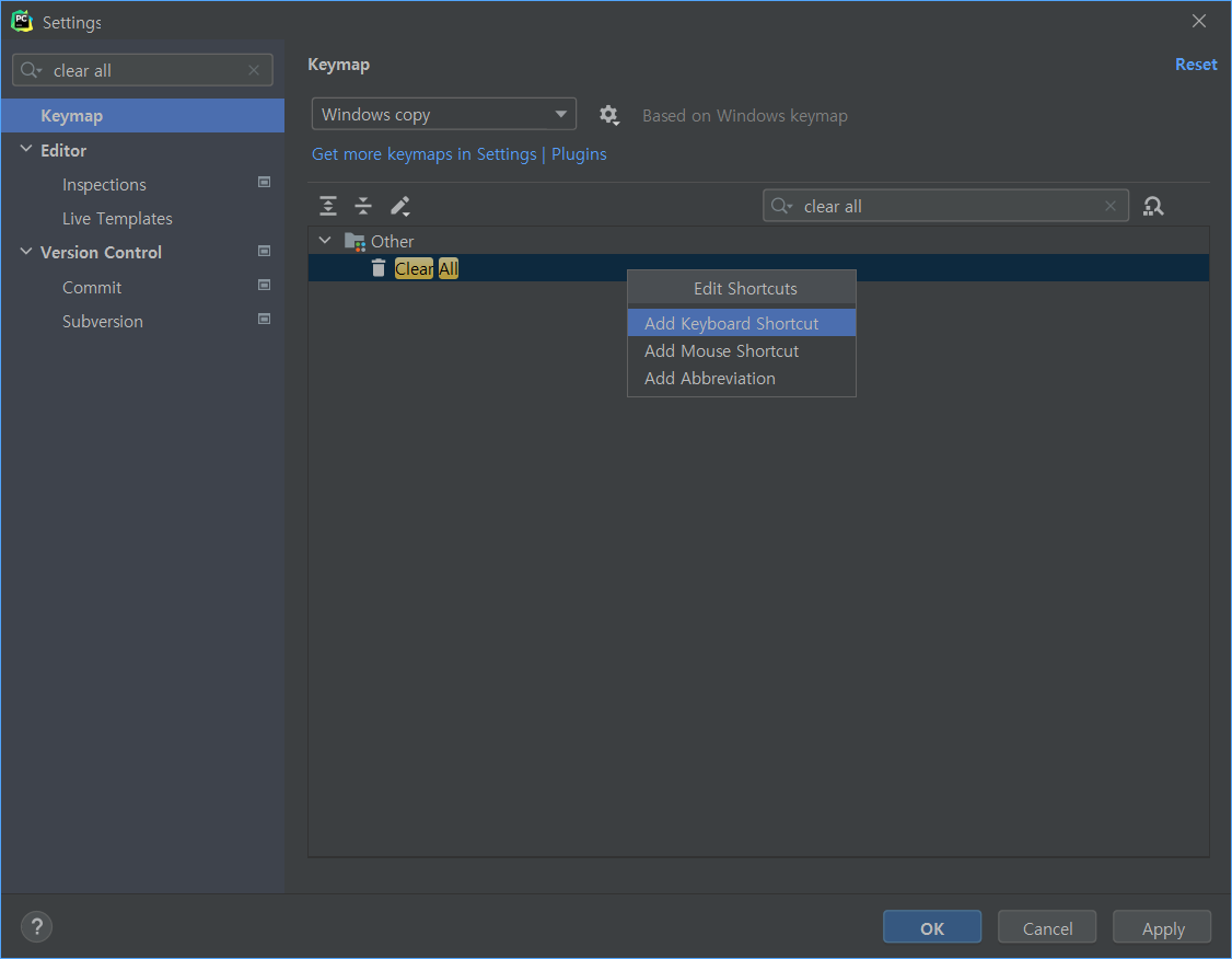 3. Keymap의 Other/Clear All 메뉴를 엔터나 더블클릭으로 선택한 후 "Add Keyboard Shortcut"을 다시 선택합니다.