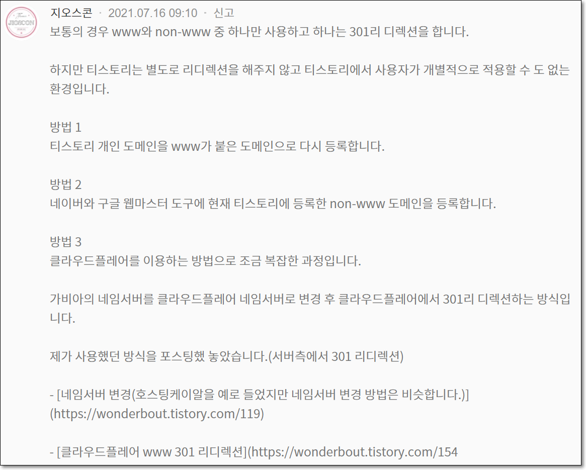 두 분 다 적절한 안내를 해 주셔서 몇 년 묵은 체증이 싹 내려가는 기분이었습니다. 요몇년간은 www가 없으면 접속이 안 되었고, 며칠전부터는 www가 있으면 접속이 안 되었는데 클라우드플레어(무료)를 사용해서 해결할 수 있다는 방법을 이번에야 알았고, 한 시간도 채 되지 않아 설정을 마쳤습니다.