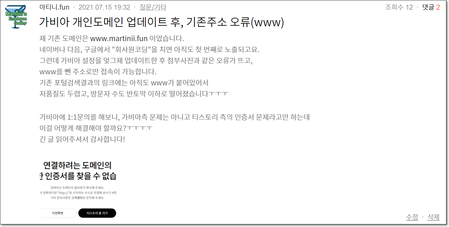 해결방법을 찾고 찾다가 티스토리에 "포럼"이라는 게시판이 있다는 걸 우연히 알았습니다. 무작정 위와 같은 질문글을 하나 남겨놓았는데, 두 분이 친절하게 답변을 주셨습니다.