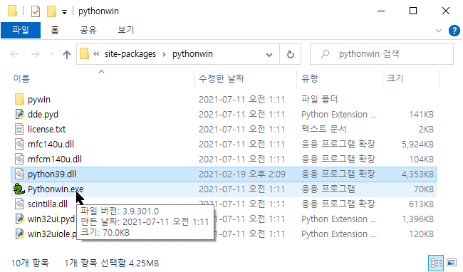 1. 가상환경의 pythonwin.exe 파일은, 커맨드프롬프트에서 activate를 하더라도 실행이 되지 않네요. 위 오류를 해결하는 방법은 저도 모르겠습니다. 가상환경 말고 글로벌환경(?)에서 python39.dll 파일을 복사해서 해당 위치에 복사해 넣으면