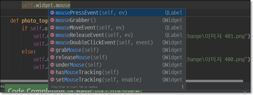 한 가지 눈여겨 봐야 할 것은, 우리가 사용할 예정인 mousePressEvent 메서드는 self 외에도 ev(이벤트)라는 인자를 받아야 한다고 표시되어 있네요? ev는 어차피 무시할 거지만, photo_toggle이라는 함수를 만들 때 인자도 두 개를 넣어줘야 오류가 발생하지 않습니다.