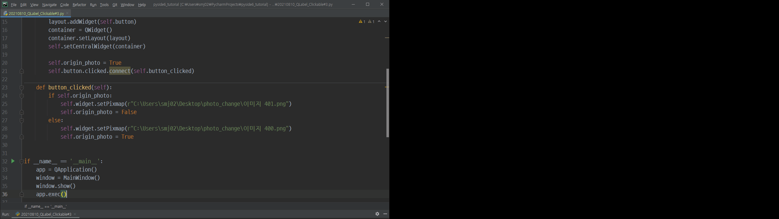 상단의 메인윈도우 생성자(__init__)에서 self에 origin_photo라는 bool 변수를 정의해놓았습니다. 원래사진이면 origin_photo == True, 바뀐 사진이면 False로 써두고, origin_photo 상태에 따라서 다른 사진을 불러오려고 합니다. 코드 자체는 간단하죠? 맨 윗줄 괄호 안에 (self, event): 라고 인자가 두 개 들어있습니다. 이건 mousePressEvent가 두 개의 인자를 받아야 하는 메서드이기 때문입니다. (실제로 photo_toggle 함수 어디에도 event 파라미터를 사용하지는 않았습니다.)