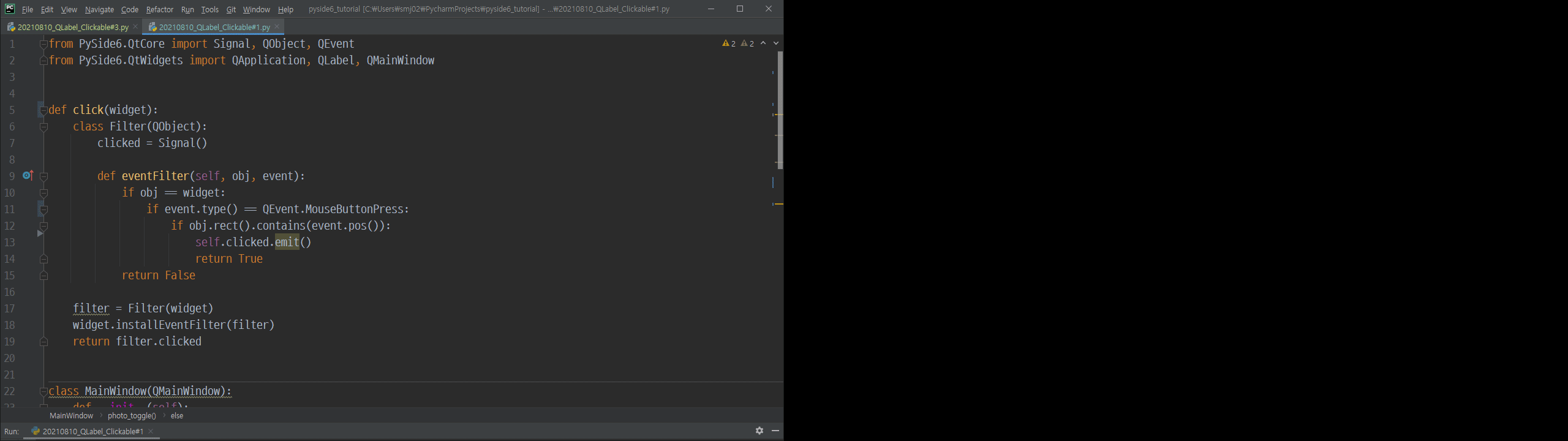한 가지 눈여겨 봐야 할 것은, 우리가 사용할 예정인 mousePressEvent 메서드는 self 외에도 ev(이벤트)라는 인자를 받아야 한다고 표시되어 있네요? ev는 어차피 무시할 거지만, photo_toggle이라는 함수를 만들 때 인자도 두 개를 넣어줘야 오류가 발생하지 않습니다.