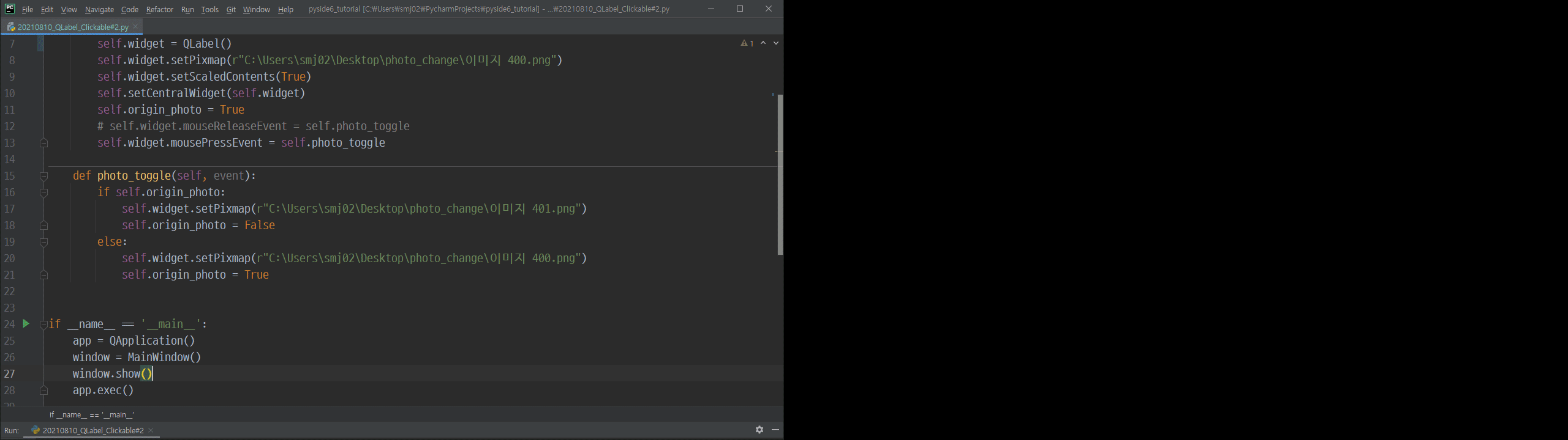 상단의 메인윈도우 생성자(__init__)에서 self에 origin_photo라는 bool 변수를 정의해놓았습니다. 원래사진이면 origin_photo == True, 바뀐 사진이면 False로 써두고, origin_photo 상태에 따라서 다른 사진을 불러오려고 합니다. 코드 자체는 간단하죠? 맨 윗줄 괄호 안에 (self, event): 라고 인자가 두 개 들어있습니다. 이건 mousePressEvent가 두 개의 인자를 받아야 하는 메서드이기 때문입니다. (실제로 photo_toggle 함수 어디에도 event 파라미터를 사용하지는 않았습니다.)