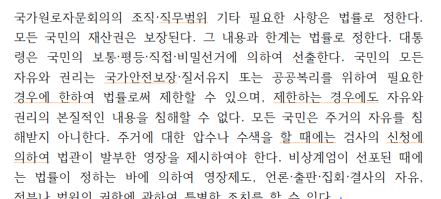 국가원로자문회의의 조직·직무범위 기타 필요한 사항은 법률로 정한다. 모든 국민의 재산권은 보장된다. 그 내용과 한계는 법률로 정한다. 대통령은 국민의 보통·평등·직접·비밀선거에 의하여 선출한다. 국민의 모든 자유와 권리는 국가안전보장·질서유지 또는 공공복리를 위하여 필요한 경우에 한하여 법률로써 제한할 수 있으며, 제한하는 경우에도 자유와 권리의 본질적인 내용을 침해할 수 없다. 모든 국민은 주거의 자유를 침해받지 아니한다. 주거에 대한 압수나 수색을 할 때에는 검사의 신청에 의하여 법관이 발부한 영장을 제시하여야 한다. 비상계엄이 선포된 때에는 법률이 정하는 바에 의하여 영장제도, 언론·출판·집회·결사의 자유, 정부나 법원의 권한에 관하여 특별한 조치를 할 수 있다.