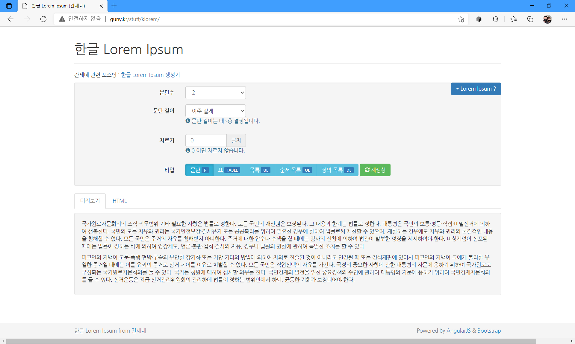 먼저 예문을 만들어봅시다. 한글Lorem Ipsum 생성기에 들어가서 아래와 같이 두 개의 문단을 만들었습니다.