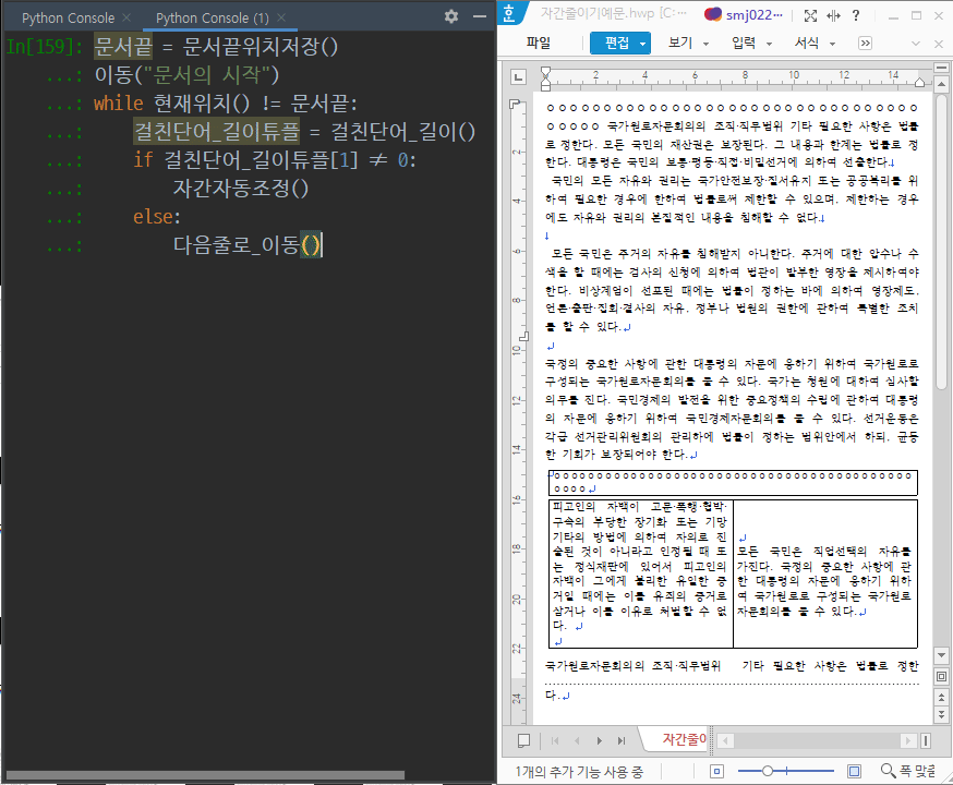 한글 = 한글시작(visible=True, open_file=r"C:\Users\smj02\PycharmProjects\hwptest\20210814_자간자동조정\자간줄이기예문.hwp")