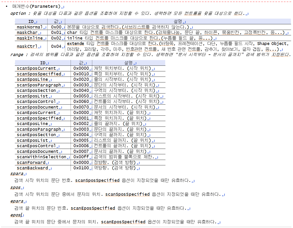 재미있는 점은, 탐색범위 지정이 굉장히 유연한데, InitScan 실행시 option과 Range 파라미터를 사용해서 옵션과 탐색범위를 정할 수 있습니다. 예를 들어 본문만, 역순으로, 라인별로 끊어서, 단락기호별로, 블록선택한 범위 내에서, 혹은 커서위치부터 등등 굉장히 유연하며, MovePos와 SetPos를 사용해서 탐색중인 문단 혹은 글자위치로 캐럿을 옮기는 것도 간편합니다. (어떤 면에서는 찾아바꾸기 액션과 유사해 보이지만,