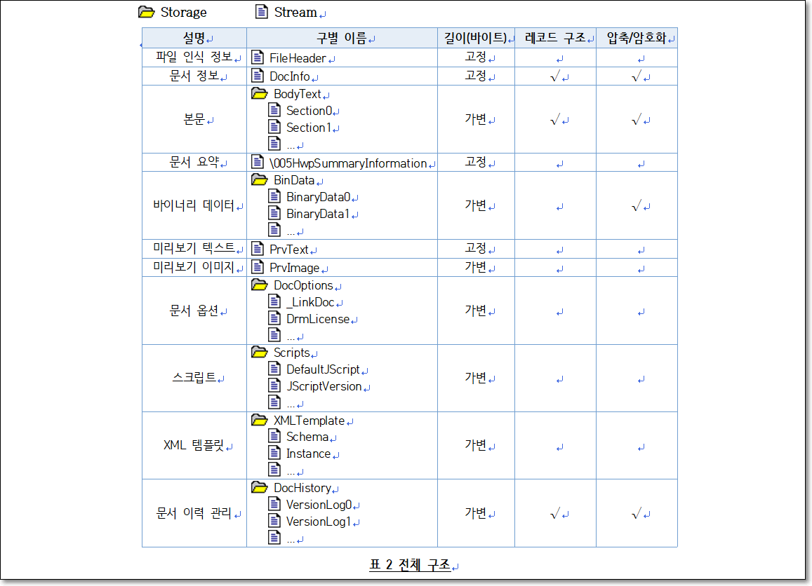 정확히는 한/글 2002 이후 문서의 구조가 그렇다는 것입니다. 한/글 3.0 등 이전 버전 문서의 포맷은 다소 다릅니다.