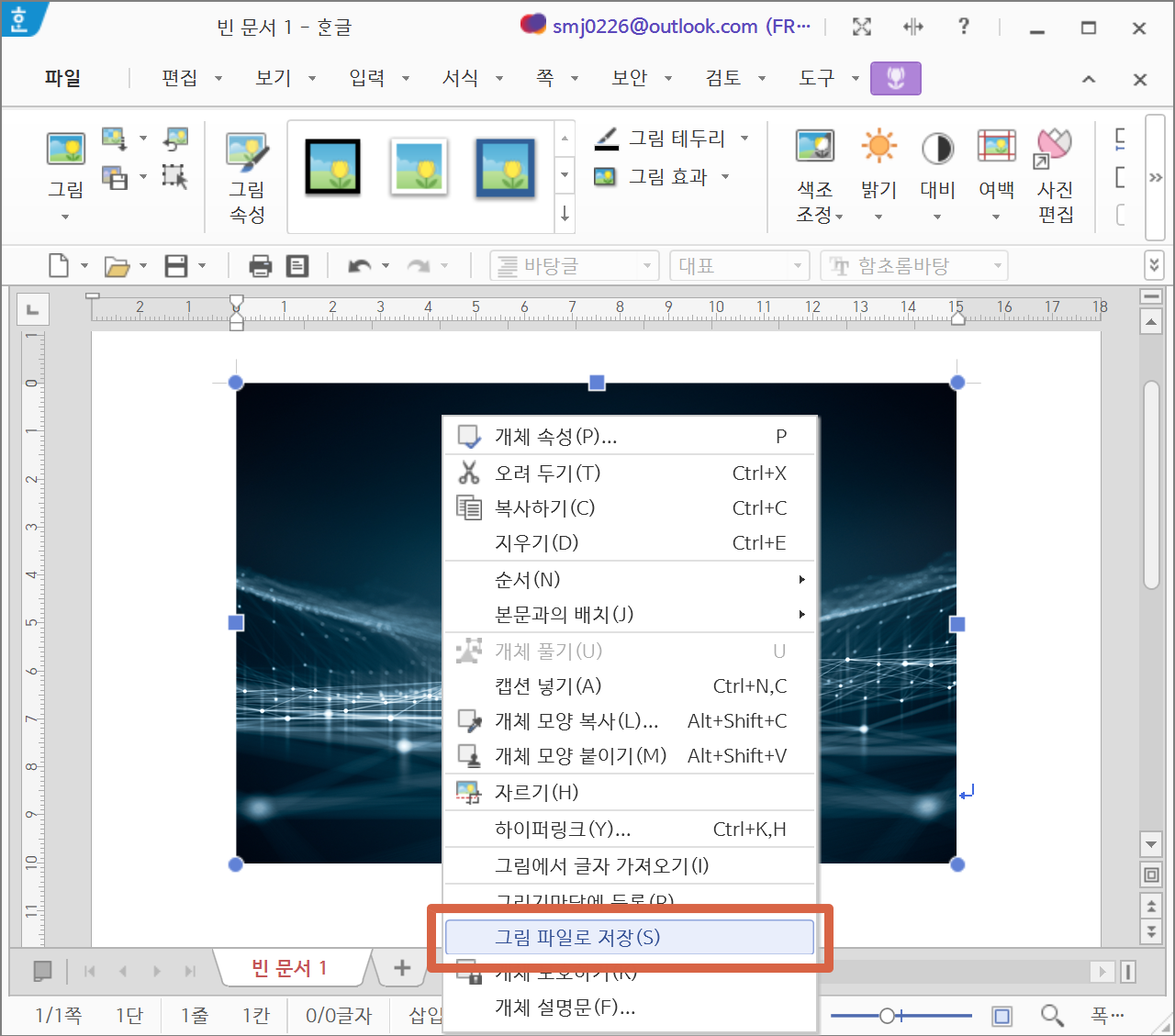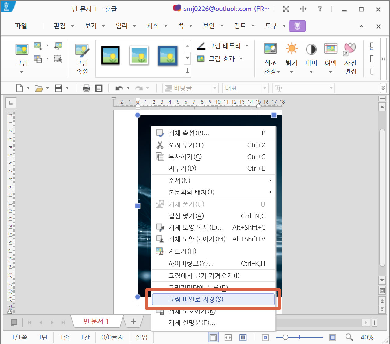 실제로 한/글 문서에 삽입한 이미지를 화질저하 없이 그대로 이미지파일로 저장하려면,