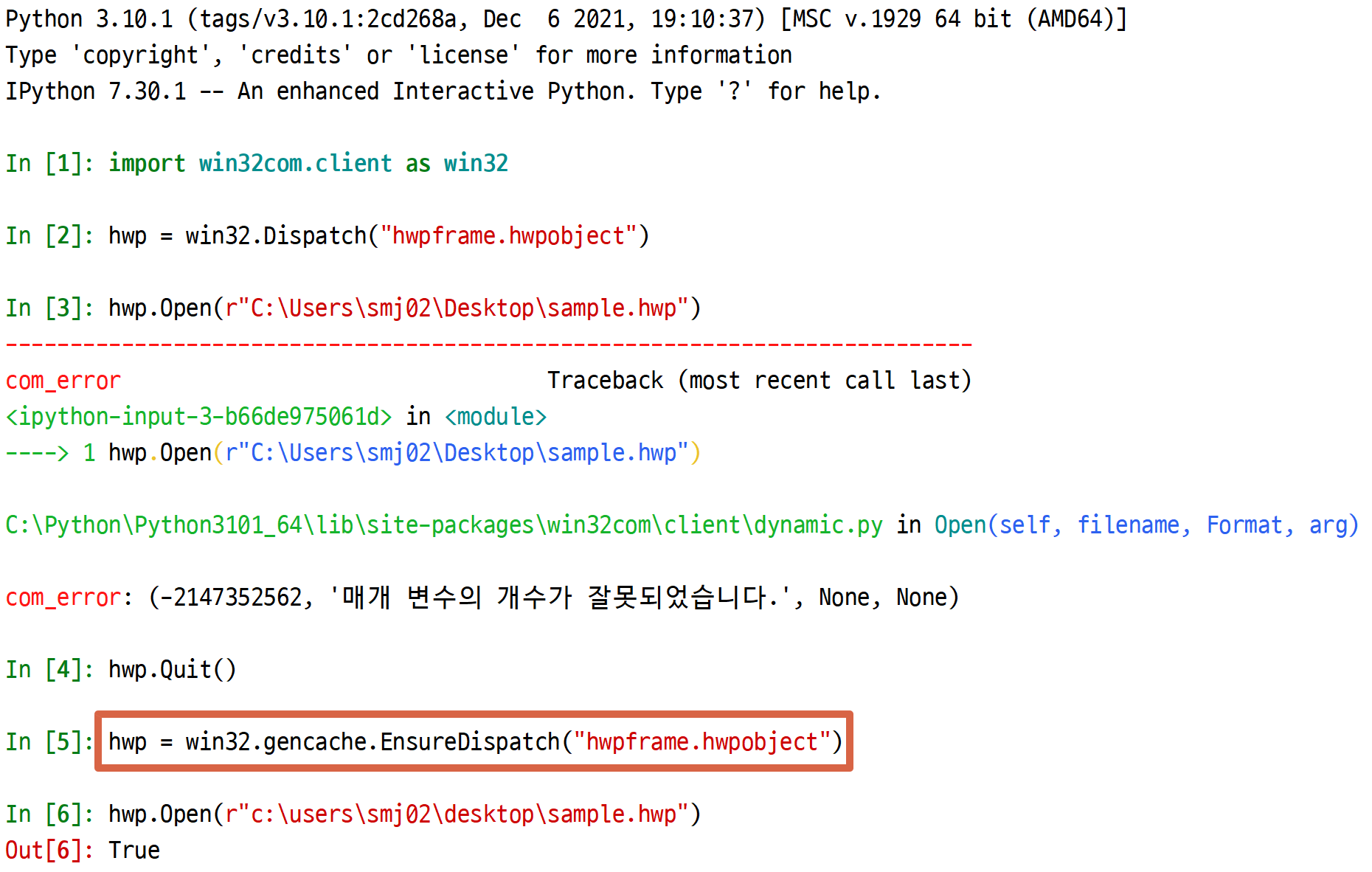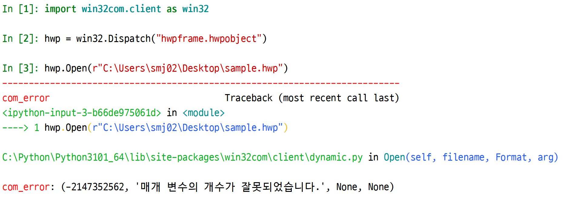 hwp.Open('c:/users/xxxxxxx/Documents/awards.hwp') Traceback (most recent call last): File "C:\ProgramData\Anaconda3\lib\site-packages\IPython\core\interactiveshell.py", line 2963, in run_code exec(code_obj, self.user_global_ns, self.user_ns) File "", line 1, in hwp.Open('c:/users/xxxxxxx/Documents/awards.hwp') File "", line 2, in open pywintypes.com_error: (-2147352562, '매개 변수의 개수가 잘못되었습니다.', None, None)