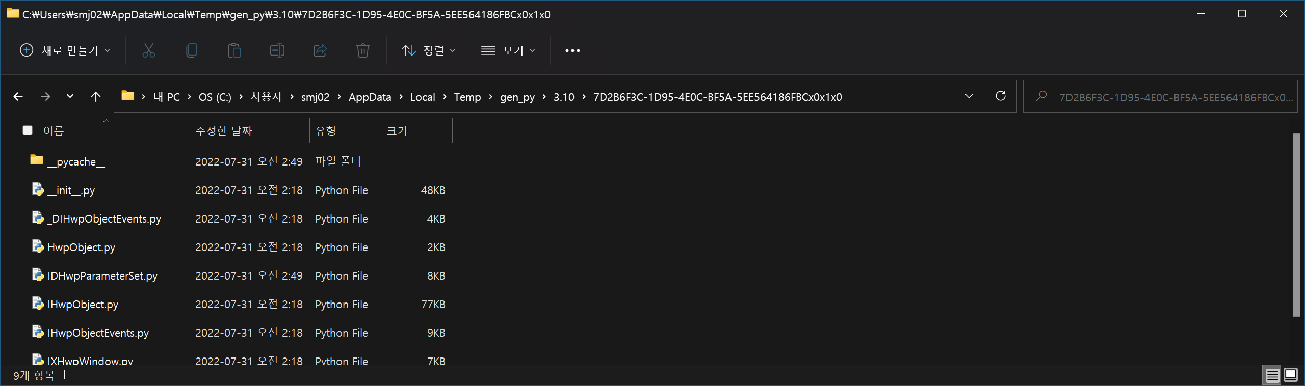 C:\Users\사용자이름\AppData\Local\Temp\gen_py 폴더 안에