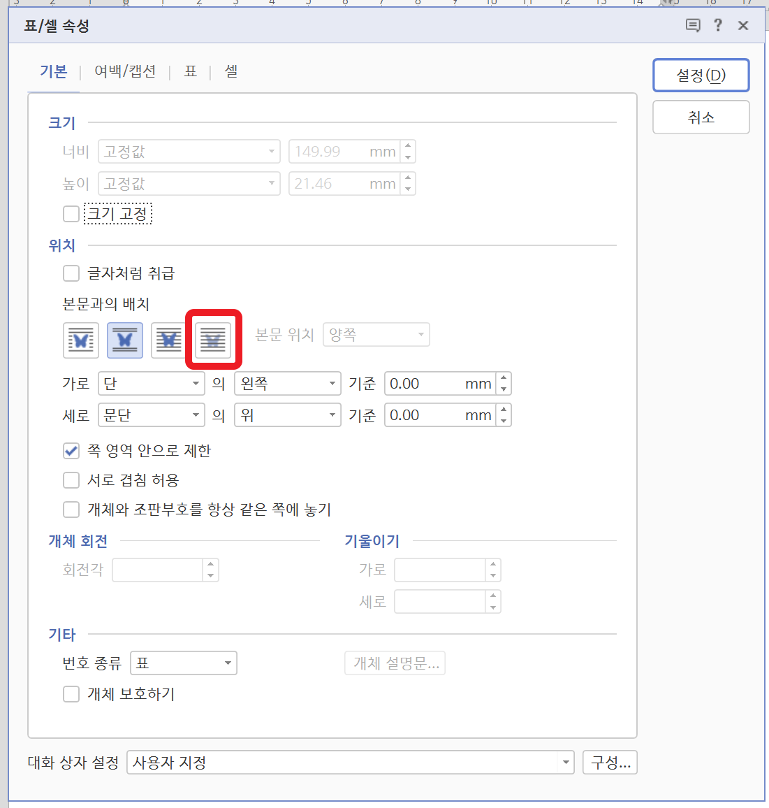 참고로 위 방법은 "본문과의 배치"를 "글 뒤로"로 설정한 값으로, 글자가 표 안에 있지 않고 표 위에 올라타고 있는(?) 상태입니다. 아래의 아이콘을 통해 설정하실 수 있습니다.