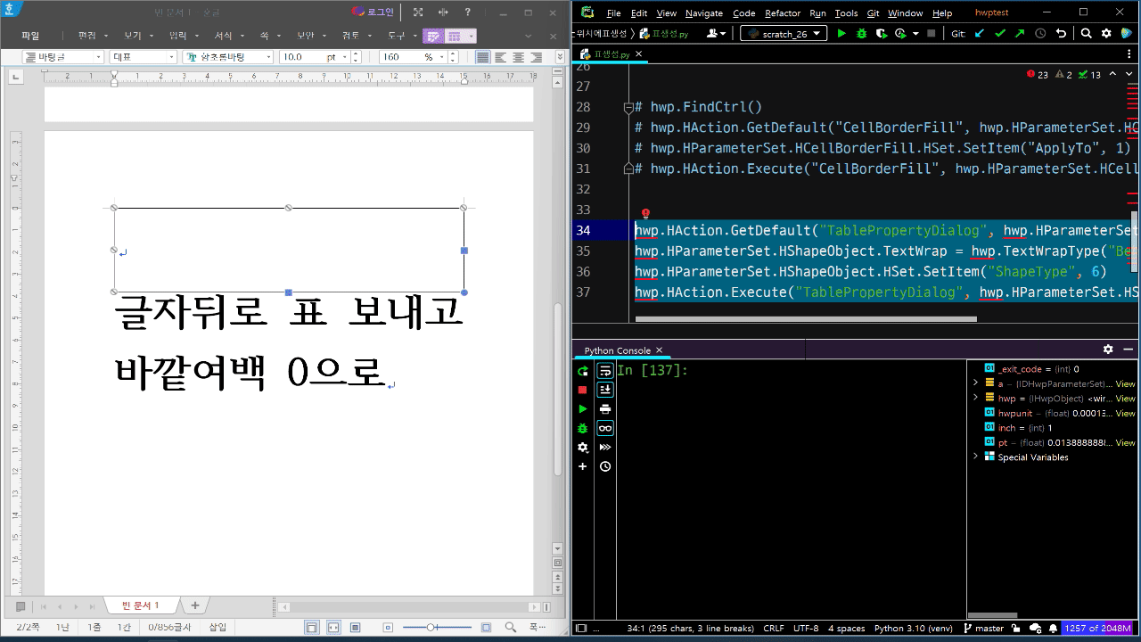 hwp.HParameterSet.HTableCreation.TableProperties.TreatAsChar = 1 # 글자처럼 취급