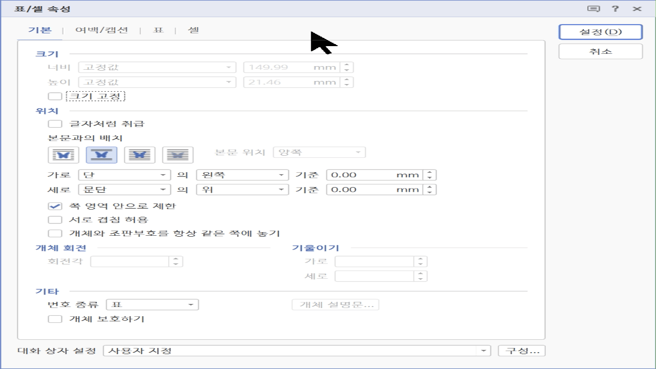 hwp.HParameterSet.HTableCreation.TableProperties.TreatAsChar = 0 # 글자처럼 취급안함