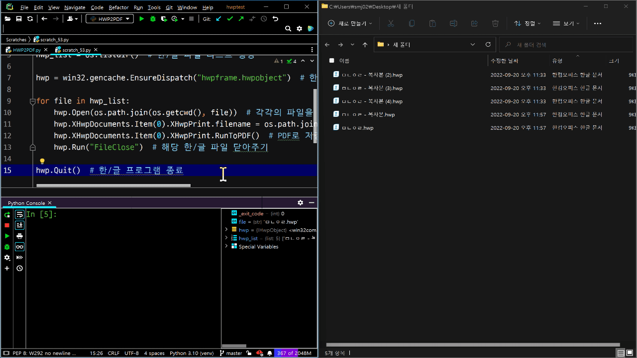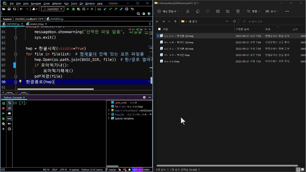 파이썬으로 여러 개의 HWP 파일을 PDF로 변환하는 건 사실 굉장히 간단한 작업입니다. 코드도 짧죠.