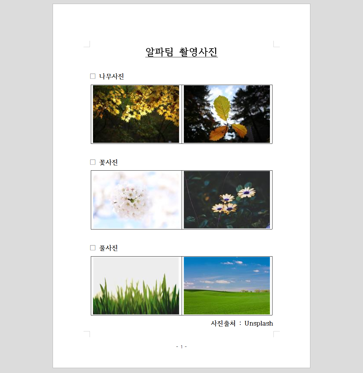 문서에는 각각 "나무사진", "꽃사진", "풀사진" 이라는 제목 아래에